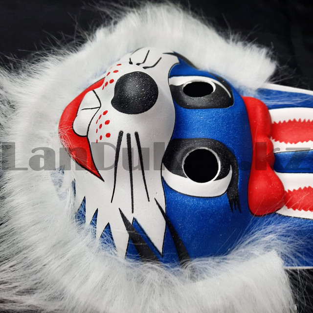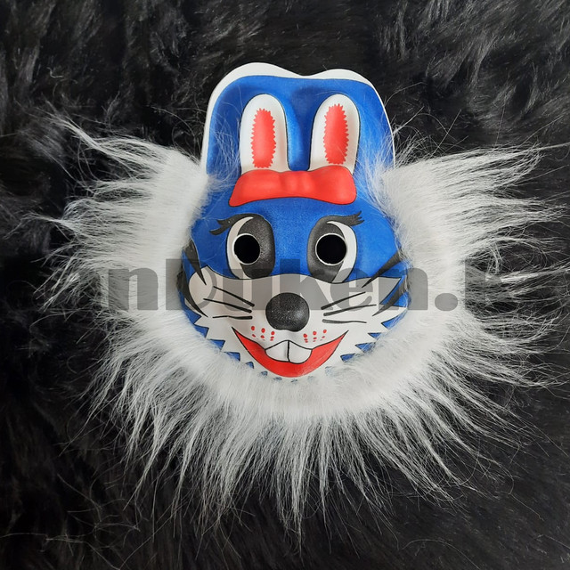 Карнавальная маска Зайца синяя — выполнена из нетоксичного легкого материала, имеет рельефную окрашенную лицевую сторону в форма головы зайца. Так же, у маски имеется окантовка из искусственного меха, имитирующая шерстяной покров белого цвета. Маска имеет регулируемое крепление из резинки и подойдет как детям, так и взрослым.