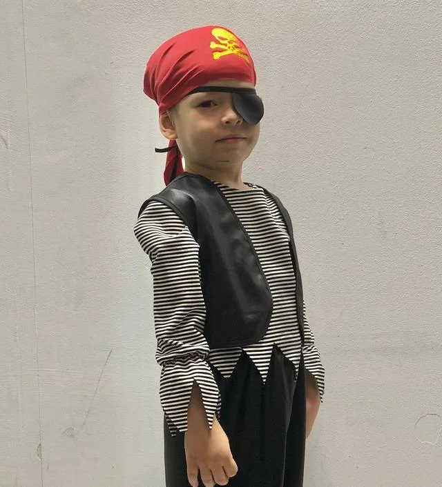 Костюм пирата на Хэллоуин. Комплект включает блузу, жилет, штаны и бандану. Дополните костюм саблей или мушкетом, повязкой на глаз или серьгой, и вперед - на абордаж!